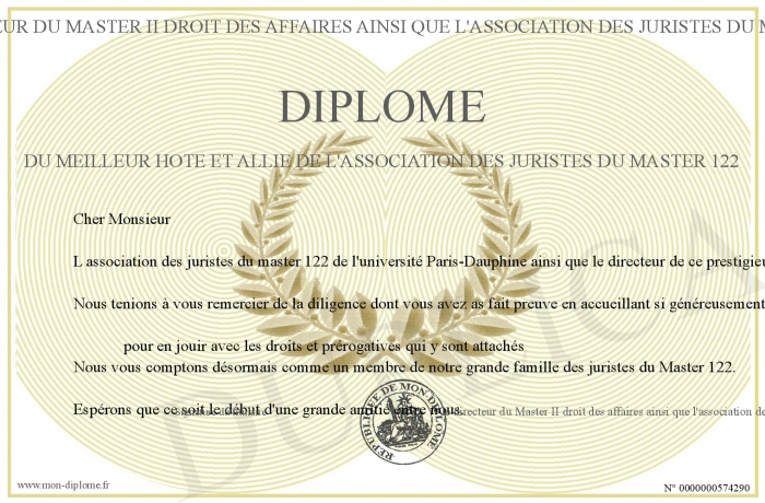 Envoyez par email votre Diplôme du meilleur hote et allié de l'association des juristes du master 122 personalisé