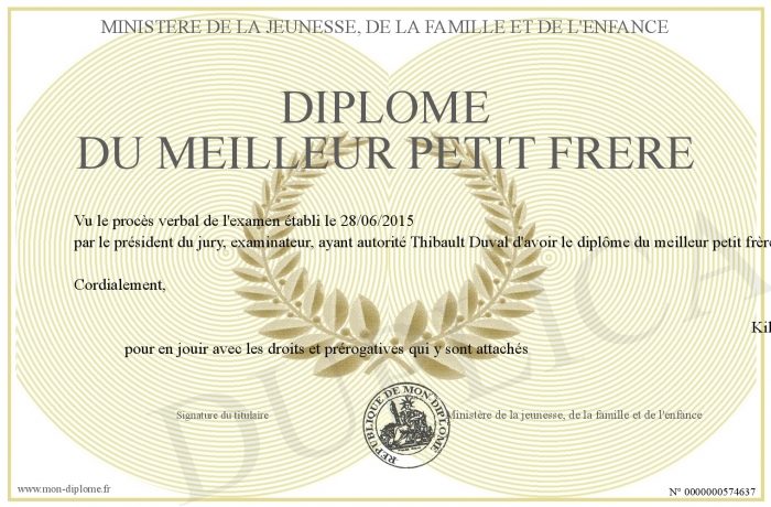 Envoyez par email votre Diplôme du meilleur petit frère personalisé