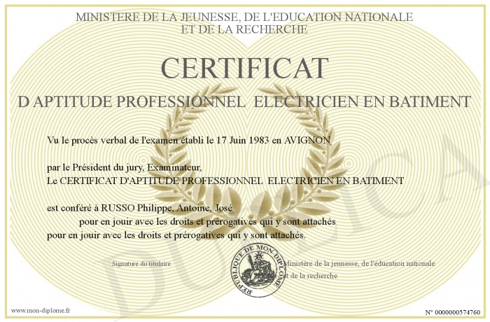 Envoyez par email votre CERTIFICAT D APTITUDE PROFESSIONNEL ELECTRICIEN EN BATIMENT personalisé