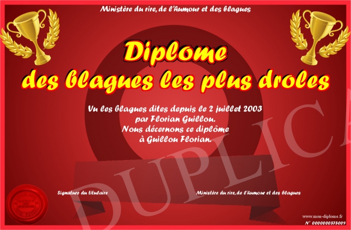 Envoyez par email votre Diplôme des blagues les plus drôles personalisé