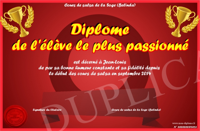 Envoyez par email votre Diplome de l'élève le plus passionné personalisé