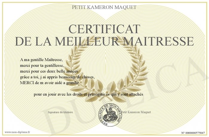 Envoyez par email votre CERTIFICAT DE LA MEILLEUR MAITRESSE personalisé