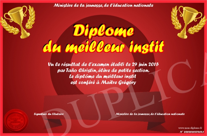 Envoyez par email votre Diplôme du meilleur instit personalisé