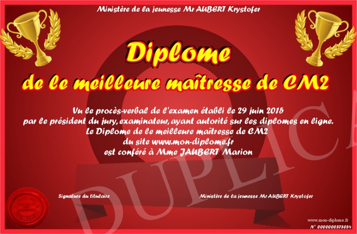 Envoyez par email votre Diplôme de le meilleure maîtresse de CM2 personalisé