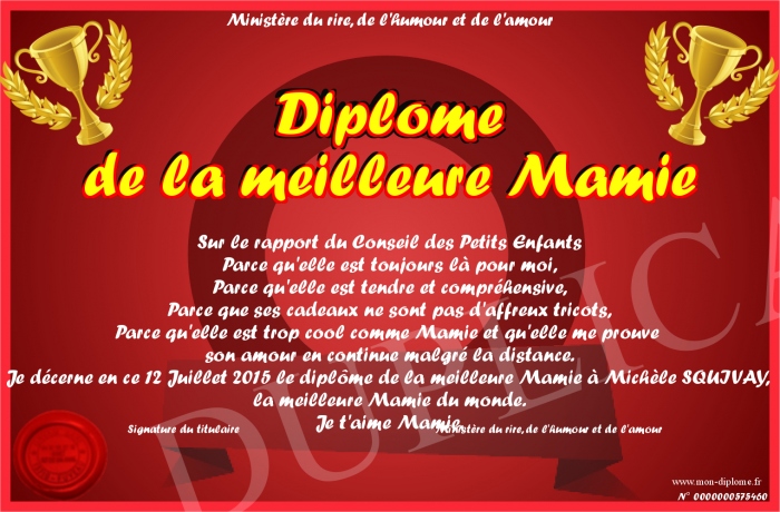 Envoyez par email votre Diplome de la meilleure Mamie personalisé