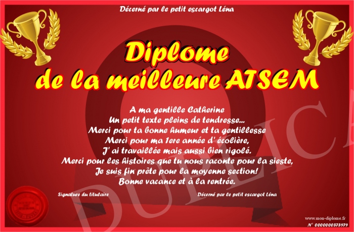 Envoyez par email votre Diplome de la meilleure ATSEM personalisé
