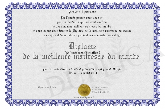 Envoyez par email votre Diplôme de la meilleure maitresse du monde personalisé