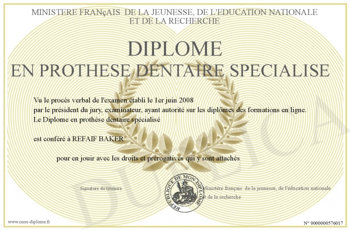 Envoyez par email votre Diplôme en prothèse dentaire spécialisé personalisé
