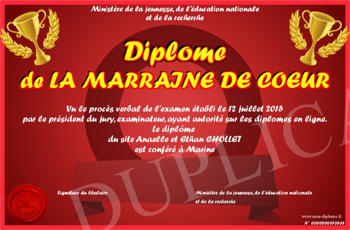 Envoyez par email votre Diplôme de LA MARRAINE DE COEUR personalisé
