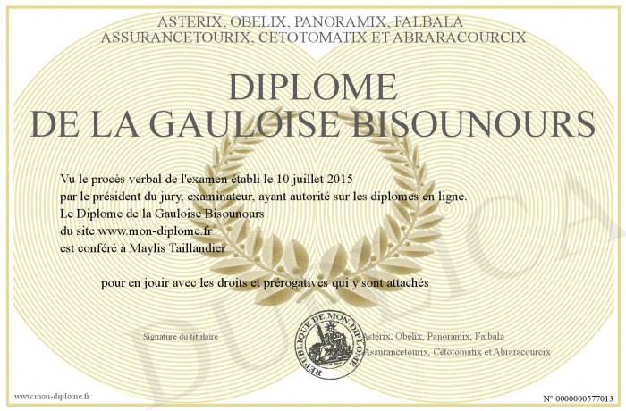 Envoyez par email votre Diplôme de la Gauloise Bisounours personalisé