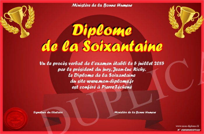 Envoyez par email votre Diplôme de la Soixantaine personalisé