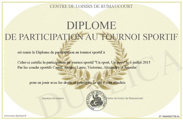 Envoyez par email votre Diplôme de participation au tournoi sportif personalisé