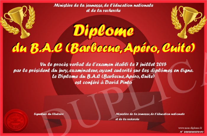 Envoyez par email votre Diplôme du B.A.C (Barbecue, Apéro, Cuite) personalisé