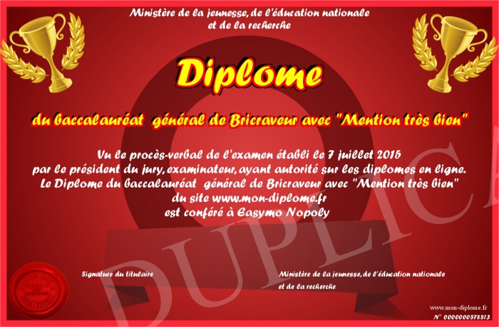 Envoyez par email votre Diplôme du baccalauréat général de Bricraveur avec -Mention très bien- personalisé