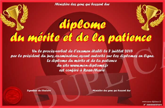 Envoyez par email votre diplôme du mérite et de la patience personalisé