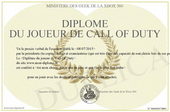 Envoyez par email votre Diplôme du joueur de Call Of Duty personalisé