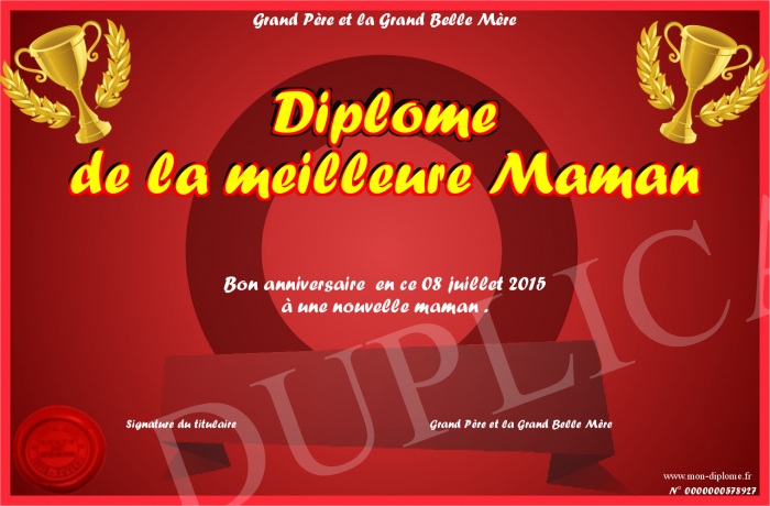 Envoyez par email votre Diplome de la meilleure Maman personalisé