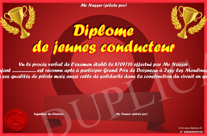 Envoyez par email votre Diplôme de jeunes conducteur personalisé