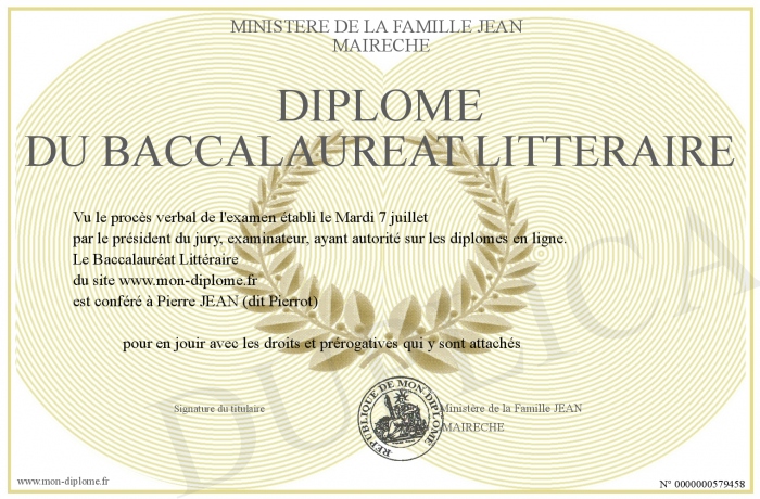 Envoyez par email votre Diplôme du Baccalaureat Littéraire personalisé
