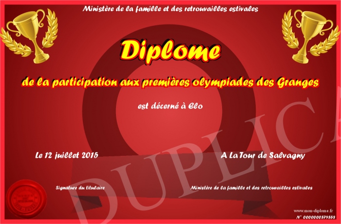 Envoyez par email votre Diplôme de la participation aux premières olympiades des Granges personalisé