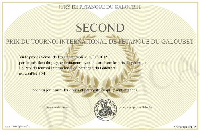 Envoyez par email votre Second Prix du tournoi international de pétanque du Galoubet personalisé