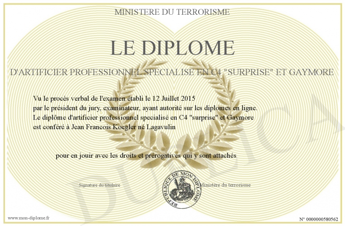 Envoyez par email votre Le diplôme d'artificier professionnel specialisé en C4 -surprise- et Gaymore personalisé