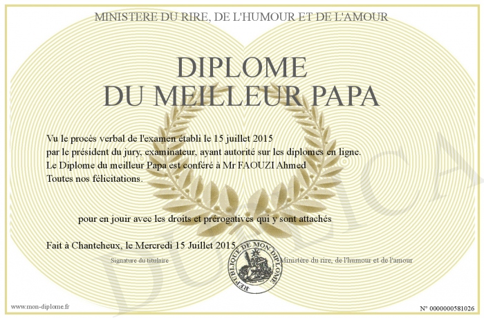 Envoyez par email votre Diplome du meilleur Papa personalisé