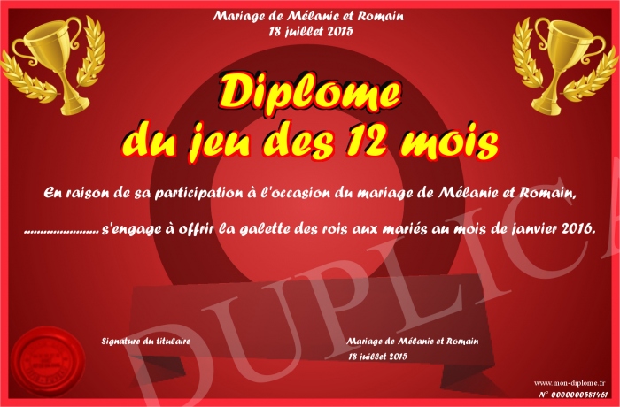 Envoyez par email votre Diplôme du jeu des 12 mois personalisé