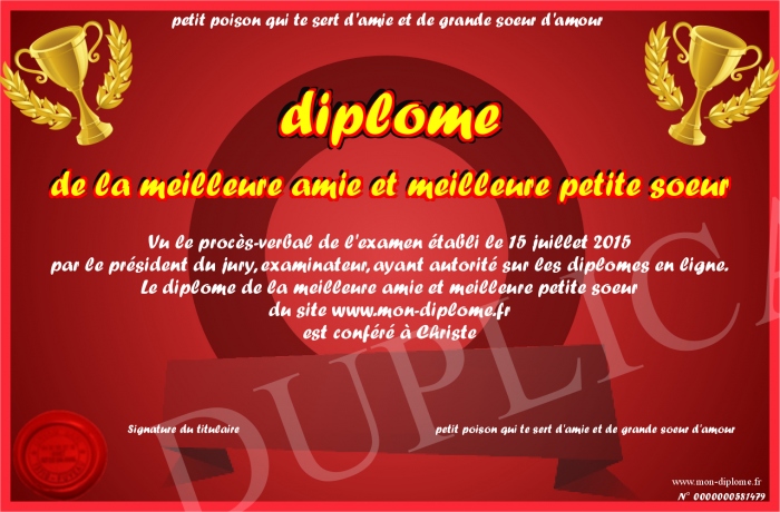 Envoyez par email votre diplôme de la meilleure amie et meilleure petite soeur personalisé