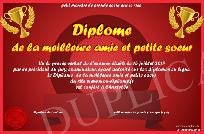 Envoyez par email votre Diplôme de la meilleure amie et petite soeur personalisé