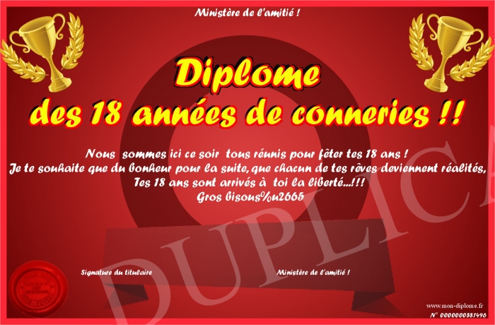 Envoyez par email votre Diplôme des 18 années de conneries !! personalisé