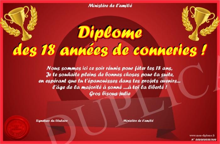 Envoyez par email votre Diplôme des 18 années de conneries ! personalisé