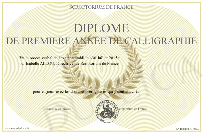 Envoyez par email votre Diplôme de première année de Calligraphie personalisé