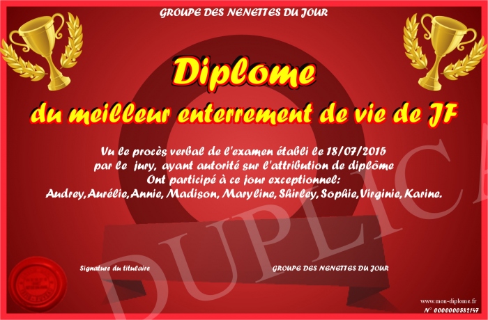 Envoyez par email votre Diplôme du meilleur enterrement de vie de JF personalisé