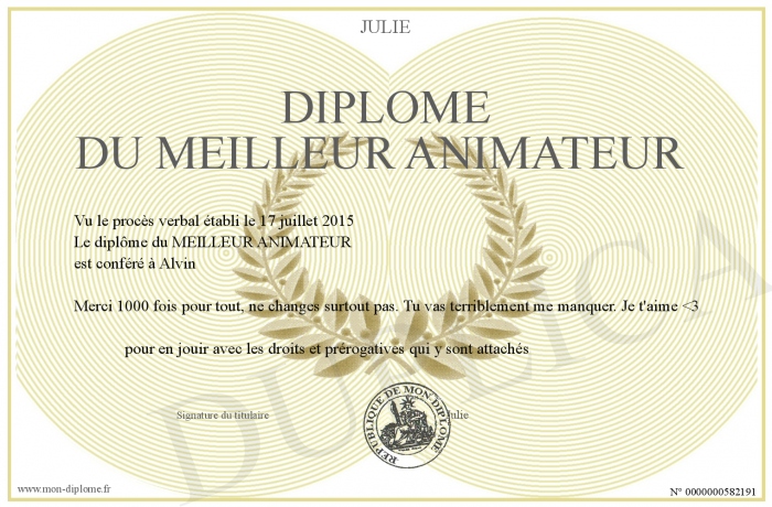Envoyez par email votre Diplôme du meilleur animateur personalisé
