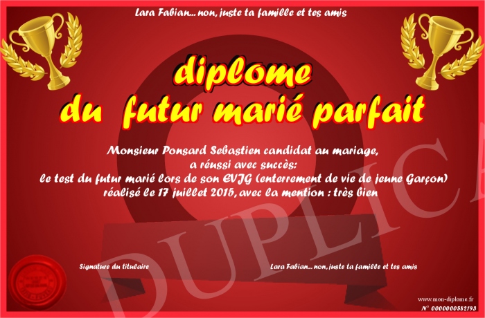 Envoyez par email votre diplôme du futur marié parfait personalisé