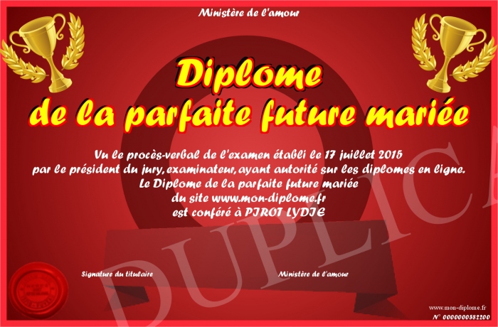 Envoyez par email votre Diplôme de la parfaite future mariée personalisé