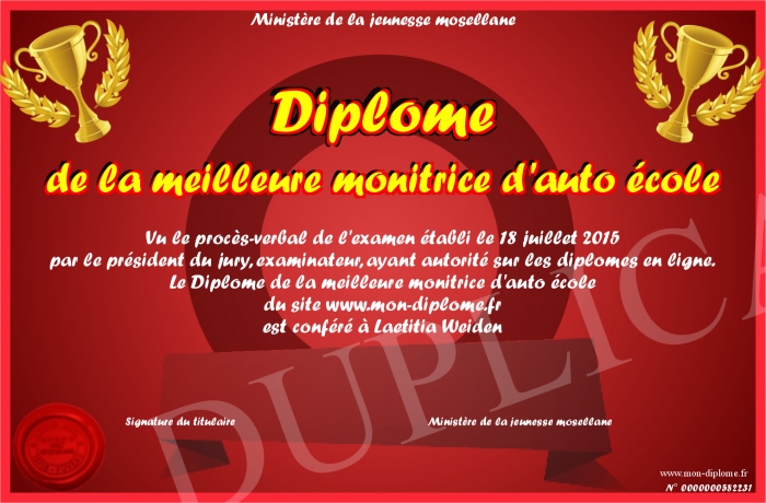 Envoyez par email votre Diplôme de la meilleure monitrice d'auto école personalisé