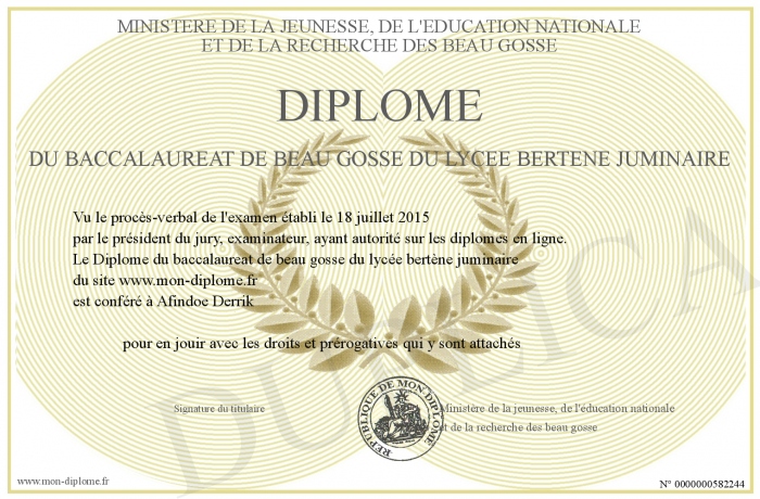 Envoyez par email votre Diplôme du baccalaureat de beau gosse du lycée bertène juminaire personalisé