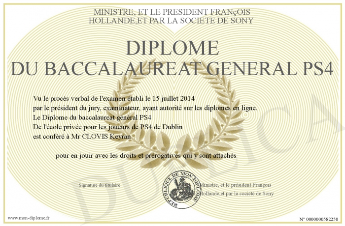 Envoyez par email votre Diplôme du baccalaureat général PS4 personalisé