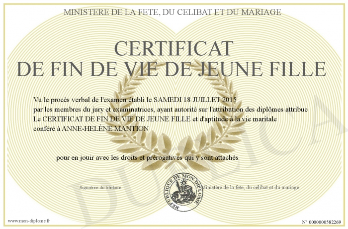 Envoyez par email votre CERTIFICAT DE FIN DE VIE DE JEUNE FILLE personalisé