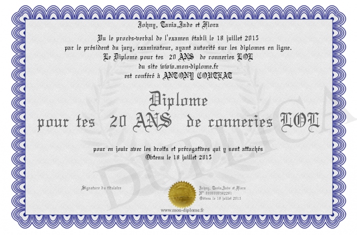 Envoyez par email votre Diplôme pour tes 20 ANS de conneries LOL personalisé