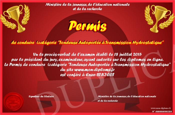 Envoyez par email votre Permis de conduire (catégorie -Tondeuse Autoportée à Transmission Hydrostatique- personalisé