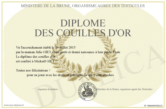 Envoyez par email votre Diplôme des Couilles d'or personalisé