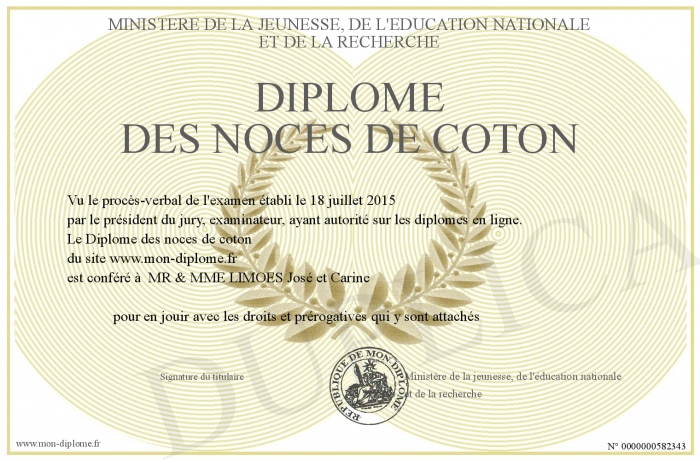 Envoyez par email votre Diplôme des noces de coton personalisé