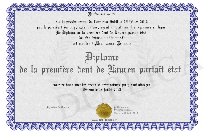 Envoyez par email votre Diplôme de la première dent de Lauren parfait état personalisé