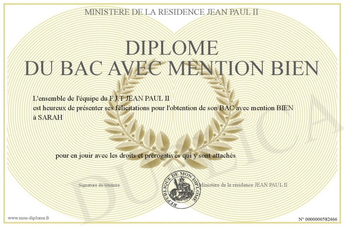 Envoyez par email votre Diplôme du BAC avec mention BIEN personalisé
