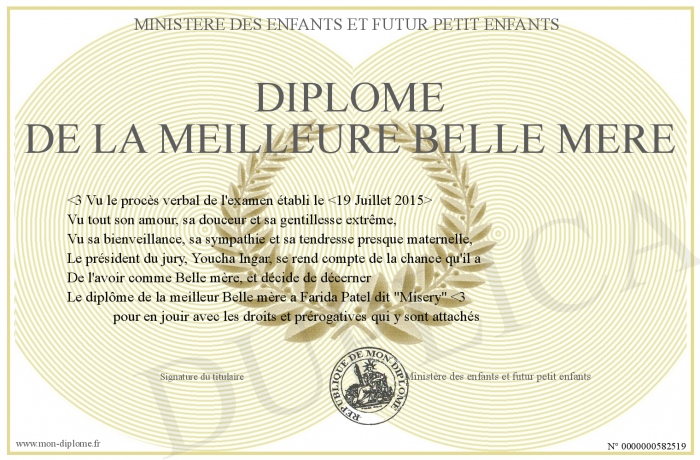 Envoyez par email votre Diplôme de la meilleure Belle Mere personalisé
