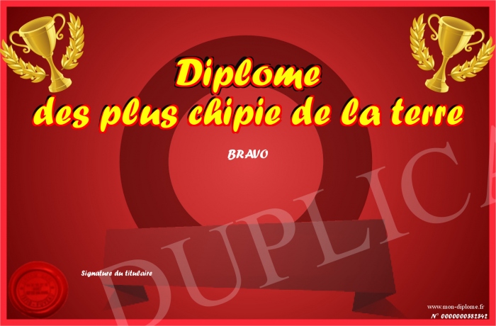 Envoyez par email votre Diplôme des plus chipie de la terre personalisé
