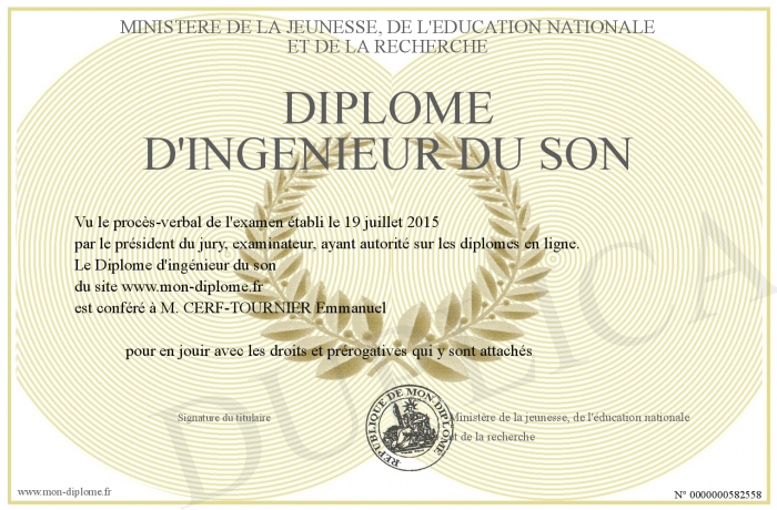 Envoyez par email votre Diplôme d'ingénieur du son personalisé